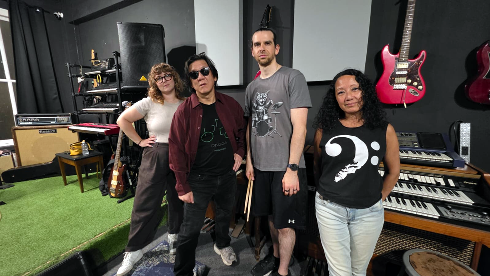 A collection of images capturing the vibrant atmosphere of a music studio, featuring various instruments and people enjoying the creative space.